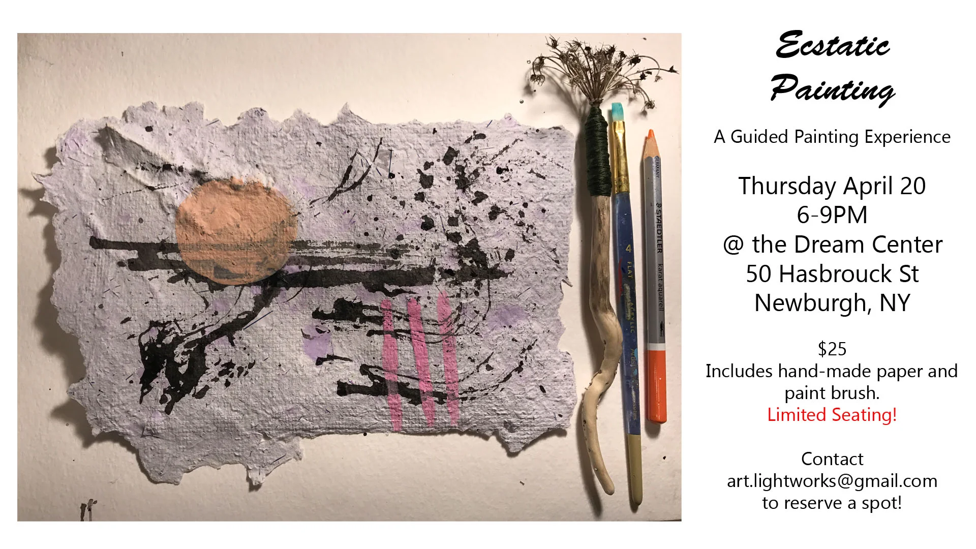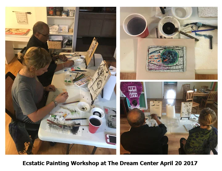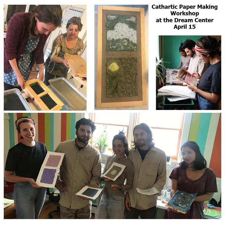 Of the workshops, I was most nervous about this one and whether it would be effective. Ecstatic painting starts with a meditation to help the participants ground themselves, find their center, and tap into a place of non judgement and embracing of their creativity. I then go on to guide the participant's actions with prompts, inviting them and encouraging them to use various colors and mediums in different ways utilizing the fundamental 'laws' of design. I have also been making primitive paintbrushes from found natural materials, so this was an interesting way to utilize and test those materials as well as incorporate the hand made recycled paper.