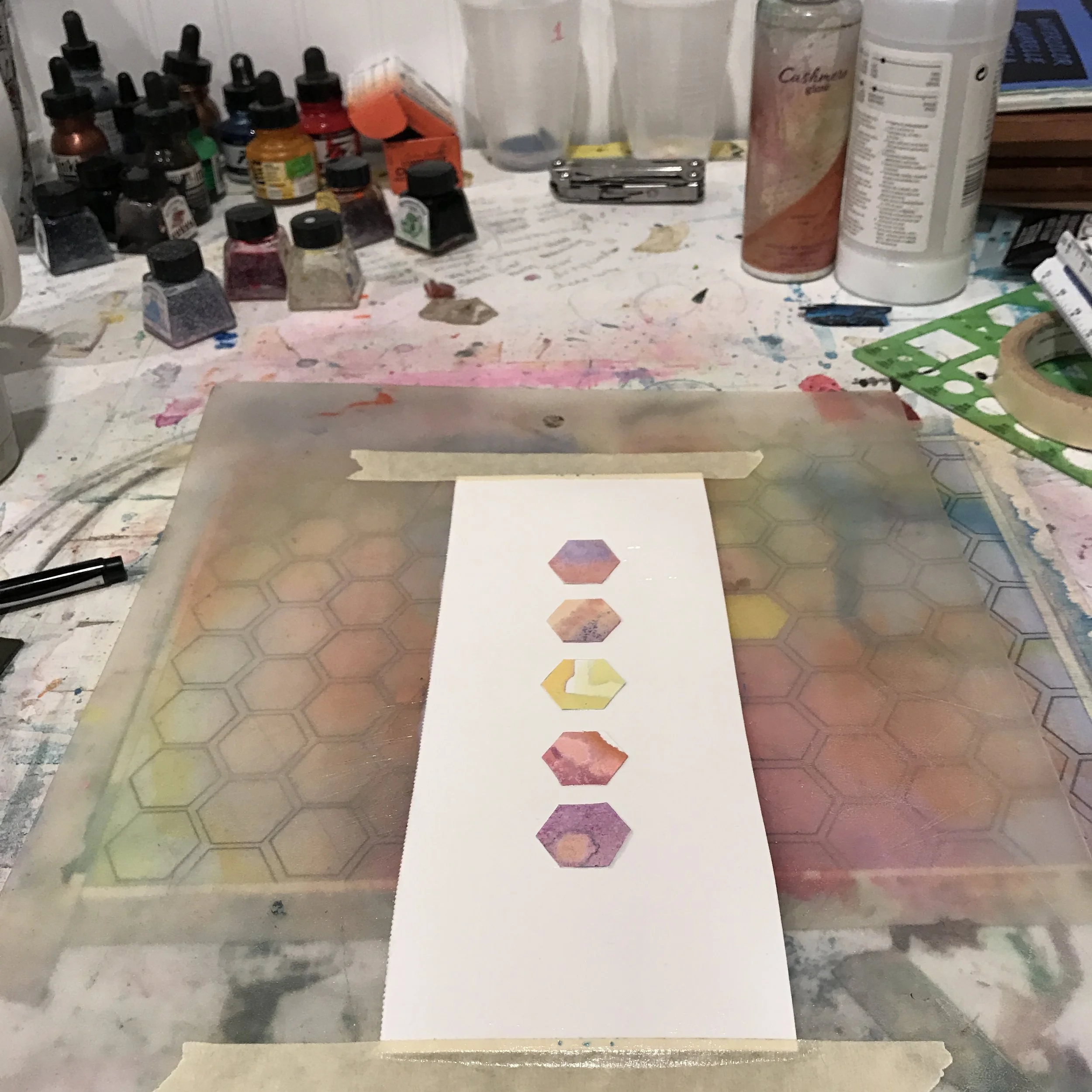Recently I had the undeniable urge to revisit the hexagon. I have years and years of unresolved watercolor/ink paintings, that were ultimately play with manipulation of the medium. I had at one time had the idea to isolate and magnify the mini compositions that organically formed, as the larger pieces would tend to lack any focus or clear movement. I remember walking into a gallery to see that very idea come to fruition, leaving me both enthralled at the validity of the concept, and somewhat frustrated that I had not had the opportunity to see it through. Patience is a virtue, and I am tickled by the fact that all these years of collecting materials, experiences, knowledge, and wisdom have culminated into this series of works that are very near and dear to my heart.