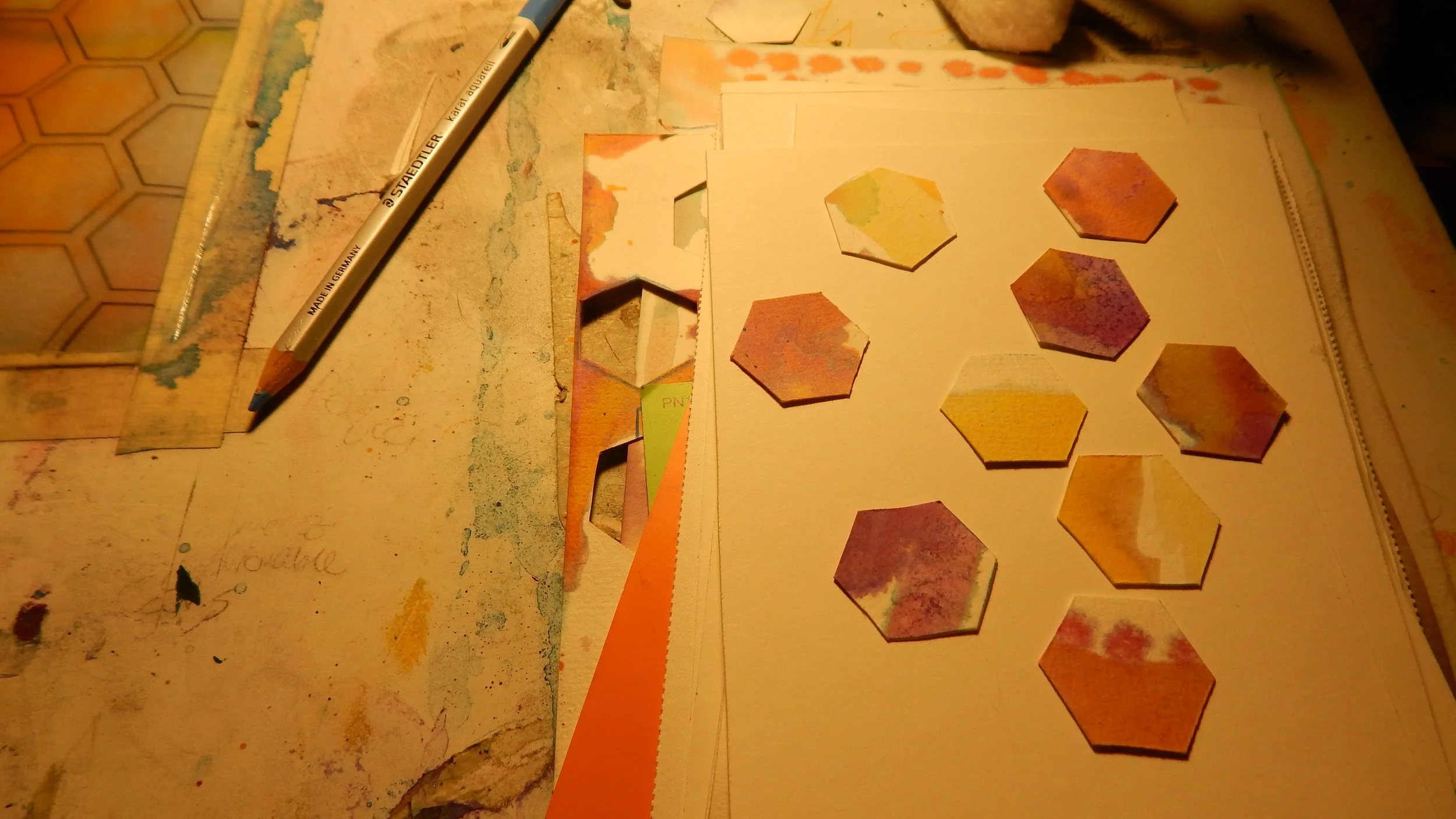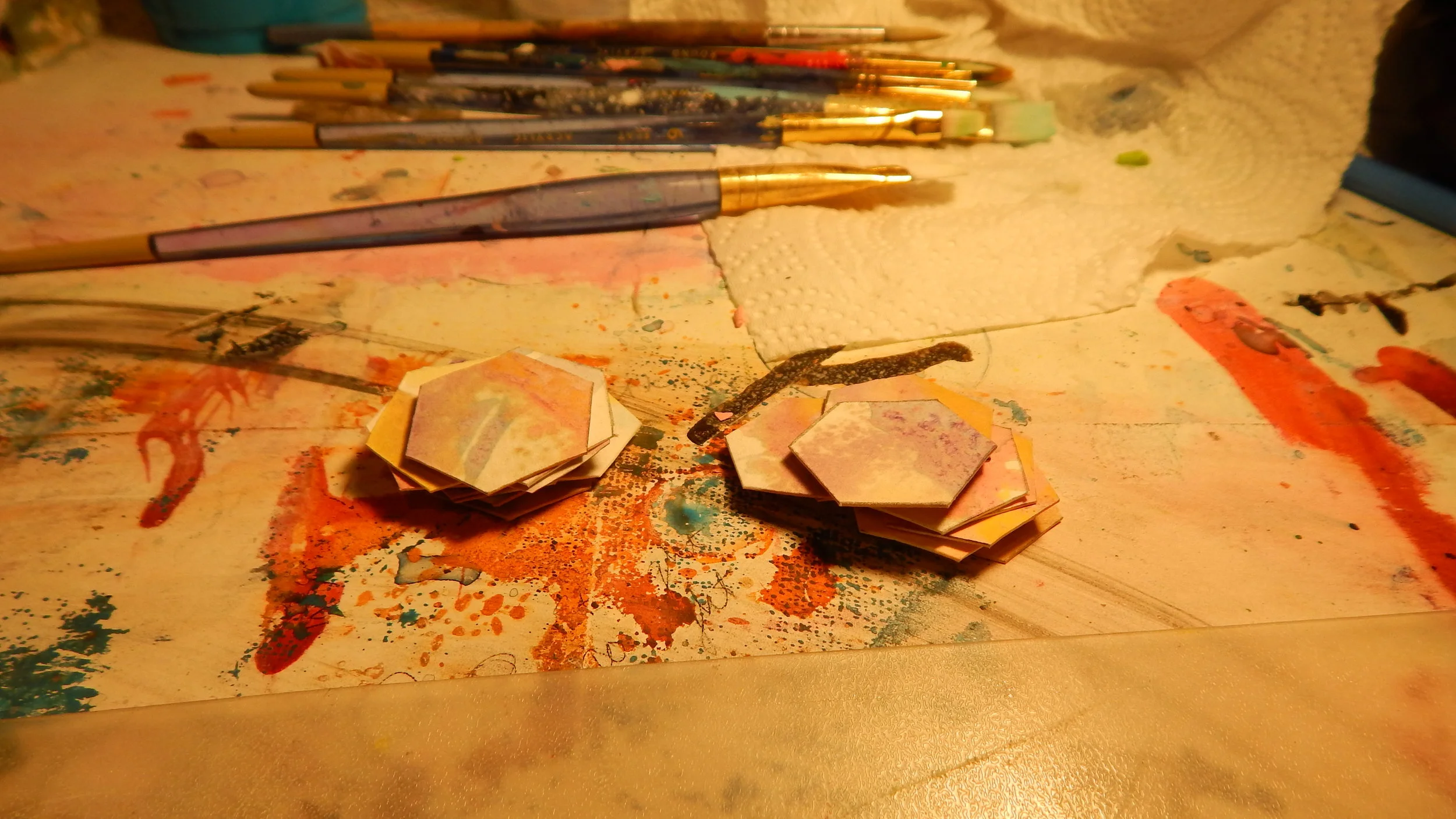 Within this entire body of work, the individual hexagon represents the individual person or entity. Each sheet of painted paper from which I extracted the hexagons encapsulates a period of time that I was working on the piece and whatever energy I infused into those moments, thus groups of the hexagons are "cut from the same cloth", much like a group of people being born in a particular place or time. However, each individual, while similar in ways to the other hexagons, bare a unique stamp of it's particular composition within the greater whole. The six faces of the hexagon represent the many facets of an individual personality that are revealed under varying circumstances. Each piece then goes on to represent the particular energy of each individual(hexagon) in a given moment. Furthermore, some of the pieces go on to explore pairings and groupings of the individuals and the subsequent energy they create as a pair, group, or collective.